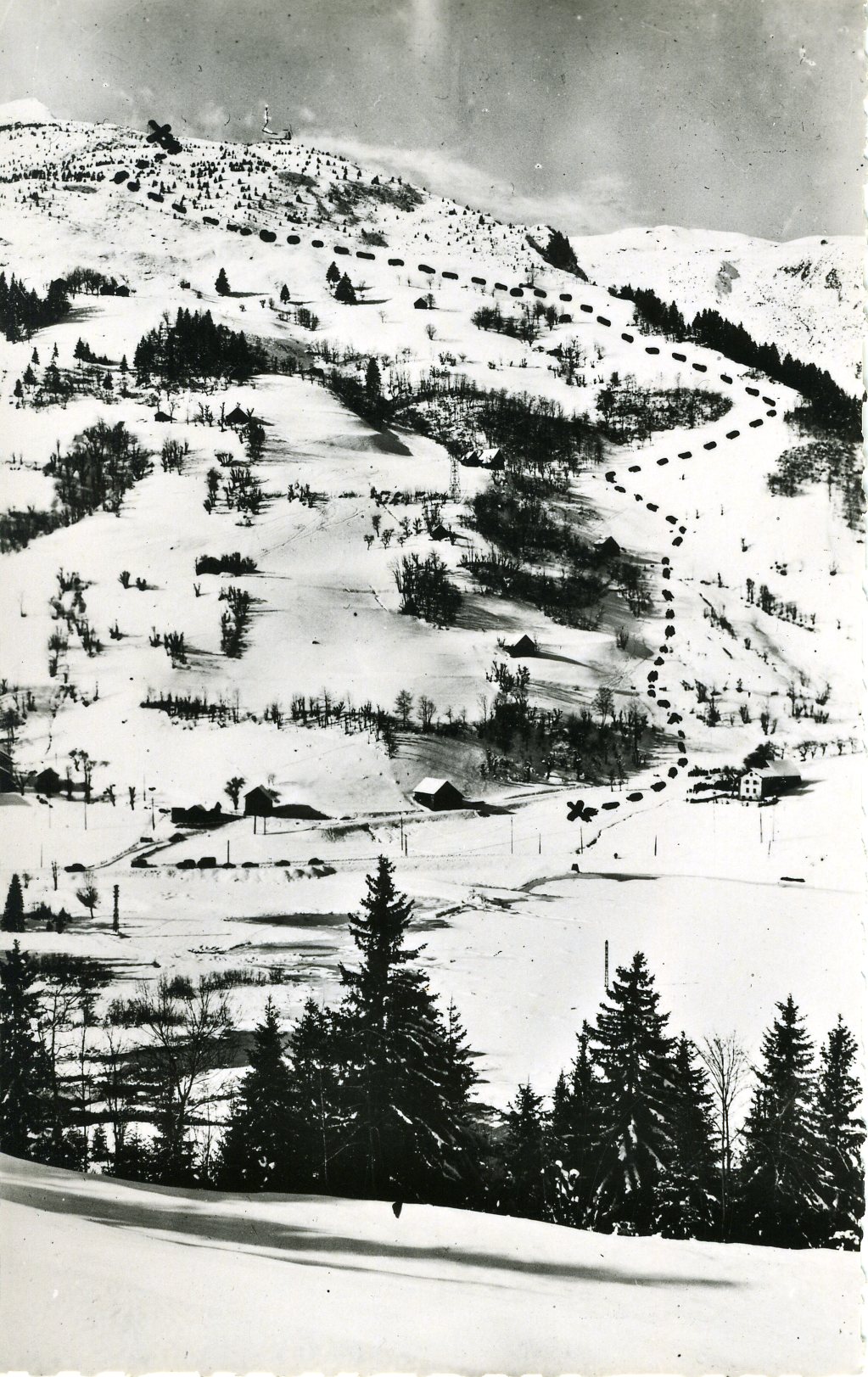 Cette carte postale monochrome présente la vue d’un paysage pris sur les hauteurs de la Vallée du Haut-Bréda, à Fond de France. Un dessin en pointillés figure sur l’image : il s’agit du tracé d’une piste de ski fédérale.