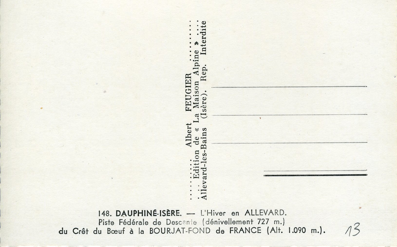 Création : FEUGIER, Albert Marius (Saint-Marcellin, 1893 – Allevard, 1962) ( photographe); Maison Alpine ( éditeur); (La Maison Alpine est une maison d’édition de cartes postales créée à Allevard par Albert Feugier.)