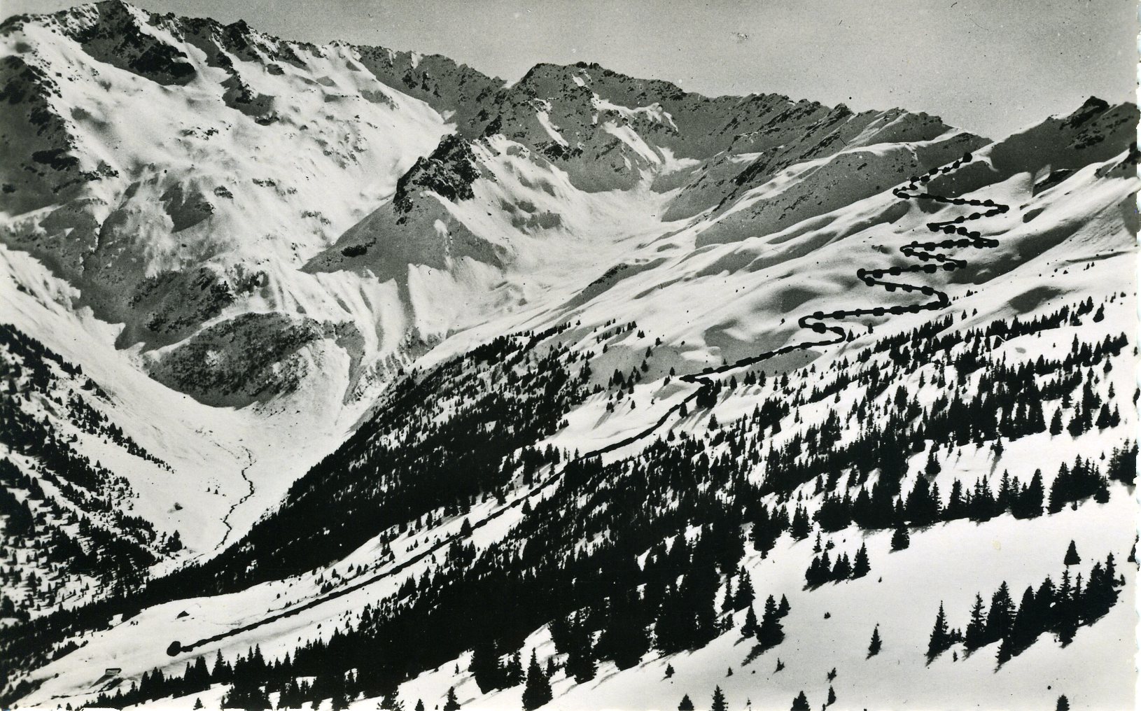 Cette carte postale monochrome présente la vue d’un paysage pris sur les hauteurs de la Vallée du Haut-Bréda. Un dessin en pointillés figure sur l’image : il s’agit du tracé d’une piste de ski de Slalom Géant.