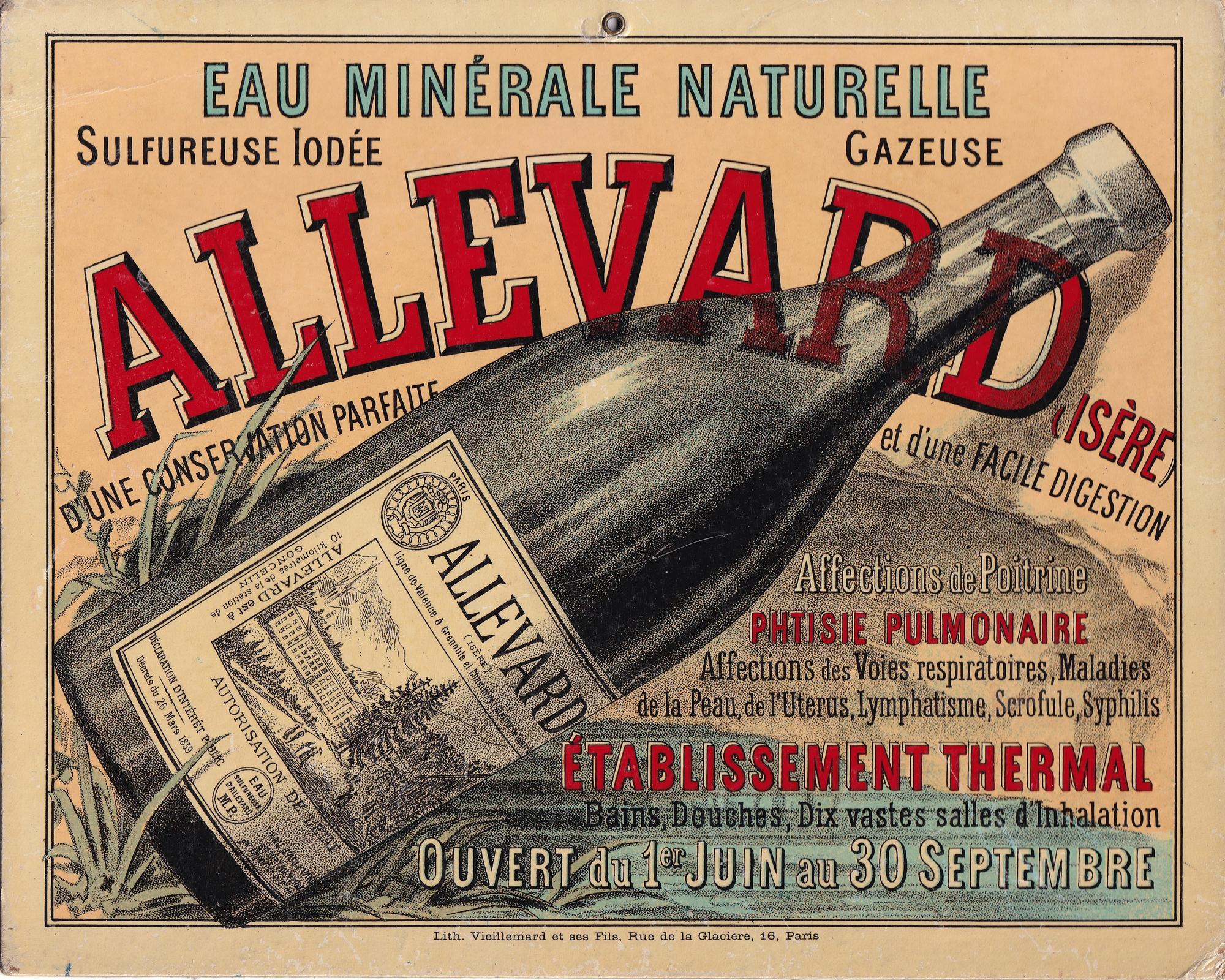 Ce carton publicitaire de petit format fait la promotion de l’eau minérale naturelle d’Allevard. On y voit au centre une bouteille d’eau de la station thermale. Autour sont inscrites les indications pour lesquelles l’eau d’Allevard est recommandée, ainsi qu’une brève description de l’établissement (« Bains, douches, Dix vastes salles d’Inhalation »), et enfin la période d’ouverture des thermes.