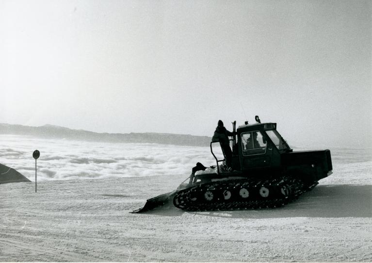 Vue d’une dameuse devant la « mer de nuages »