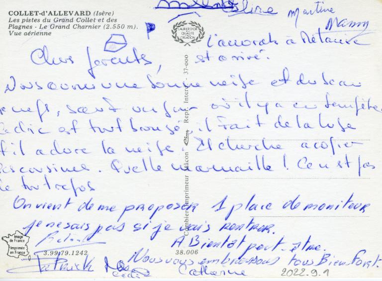 Liseré blanc autour de la photographie. La photographie était collée sur une page d’un album sur le Collet d’Allevard donné par Lucien Zacharie, avec écrit : « EXPOSITION – PHOTOS – LULU ZACHARIE 1956 LE COLLET D’ALLEVARD